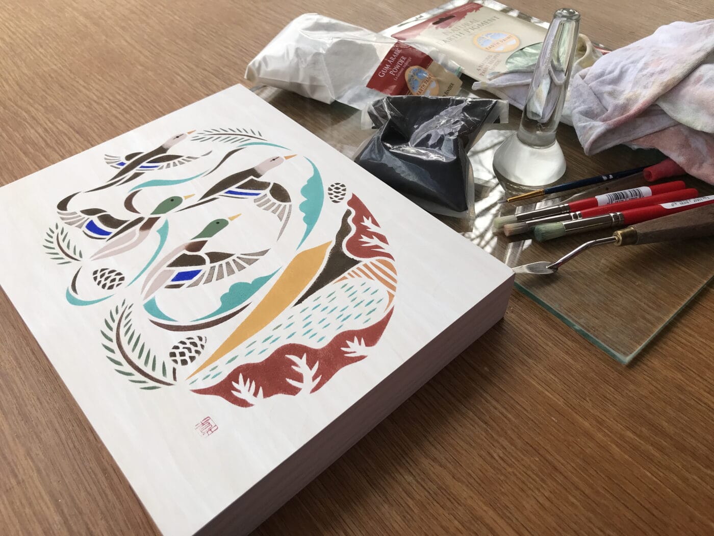 Another collection of stencil paintings in Fujino’s portfolio is titled Colors of the Hudson Valley. These are painted with natural pigments extracted from non-native plants collected locally. Fujino works closely with the Hawthorne Valley Farmscape Ecology Program in Columbia County to identify and collect the plants used to make the pigments.