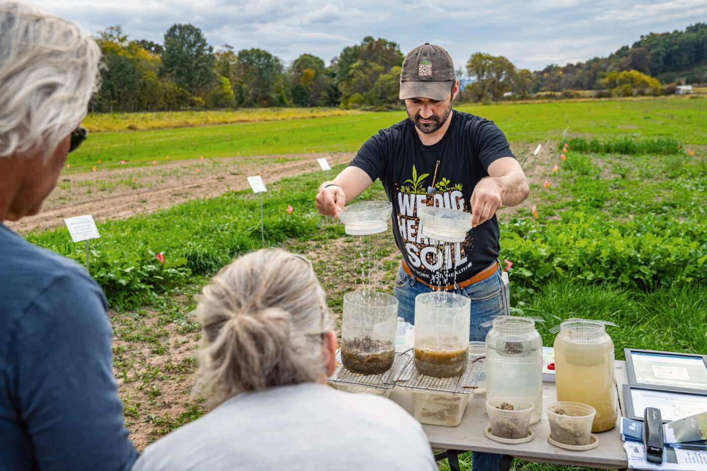 Joseph Amsili holds up two jars he’s loaded with earth: one with dirt from a standard field, and one with soil from a field that had been planted with cover crops rather than tilled. He pours water over both. The first jar clouds over and browns, the dirt dissolving into the liquid. In the second, the water drips through the black soil, which holds as one big clump, before coming out clear at the bottom of the jar.