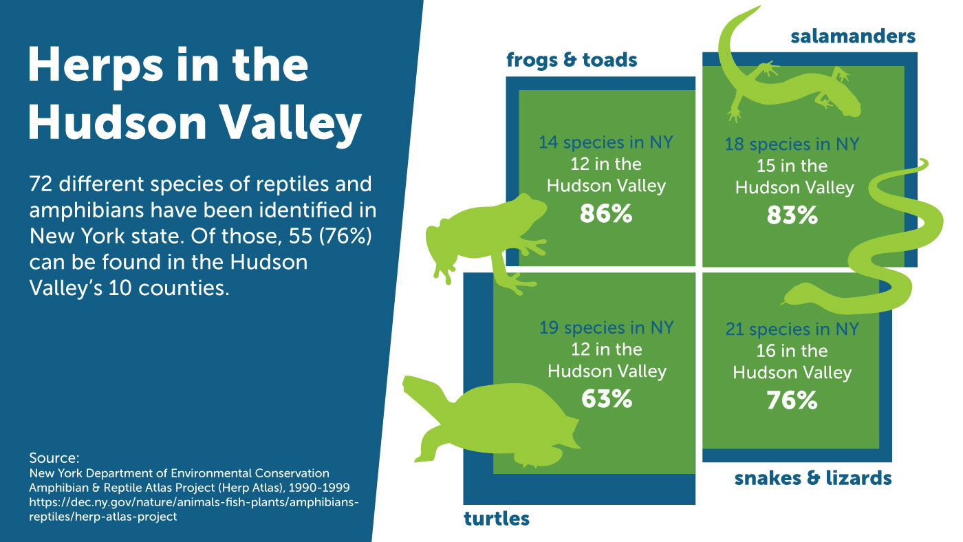 As a biodiversity hotspot, the Hudson Valley is a great place for herping. The New York State Department of Environmental Conservation did a wildlife survey known as the Herp Atlas in the 1990s, and found 72 different species of reptiles and amphibians in the state. Of these, about 55 species, or 76%, could be found in the Hudson Valley.