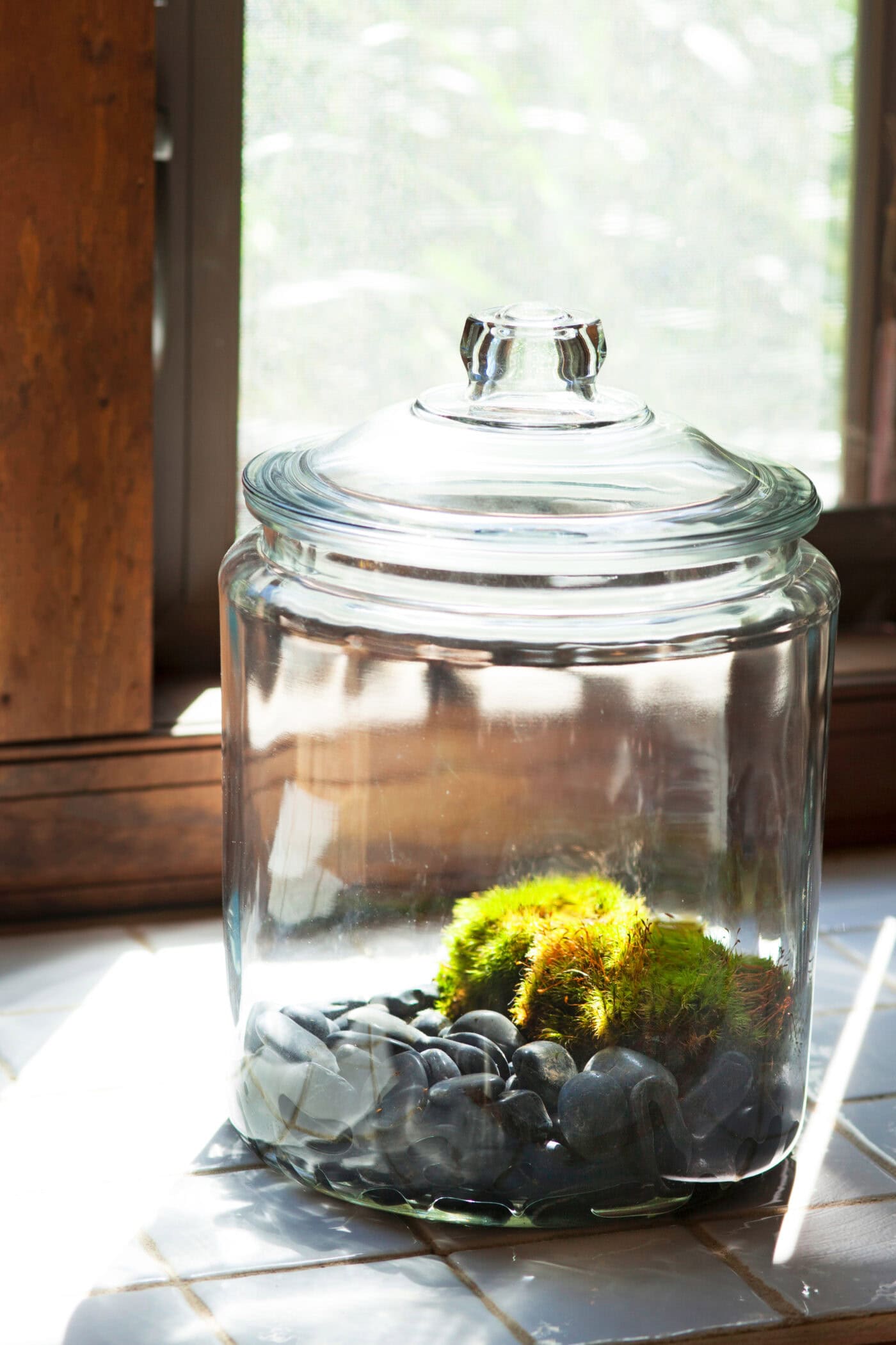 Terrariums also need about an inch of drainage material on the bottom of the vessel where any excess moisture can collect. “I like to use gravel, pebbles, or sand,” Colletti says, noting that aesthetics play a role here too. “These elements will become part of the design because everything you put into the container can be seen from the outside.”