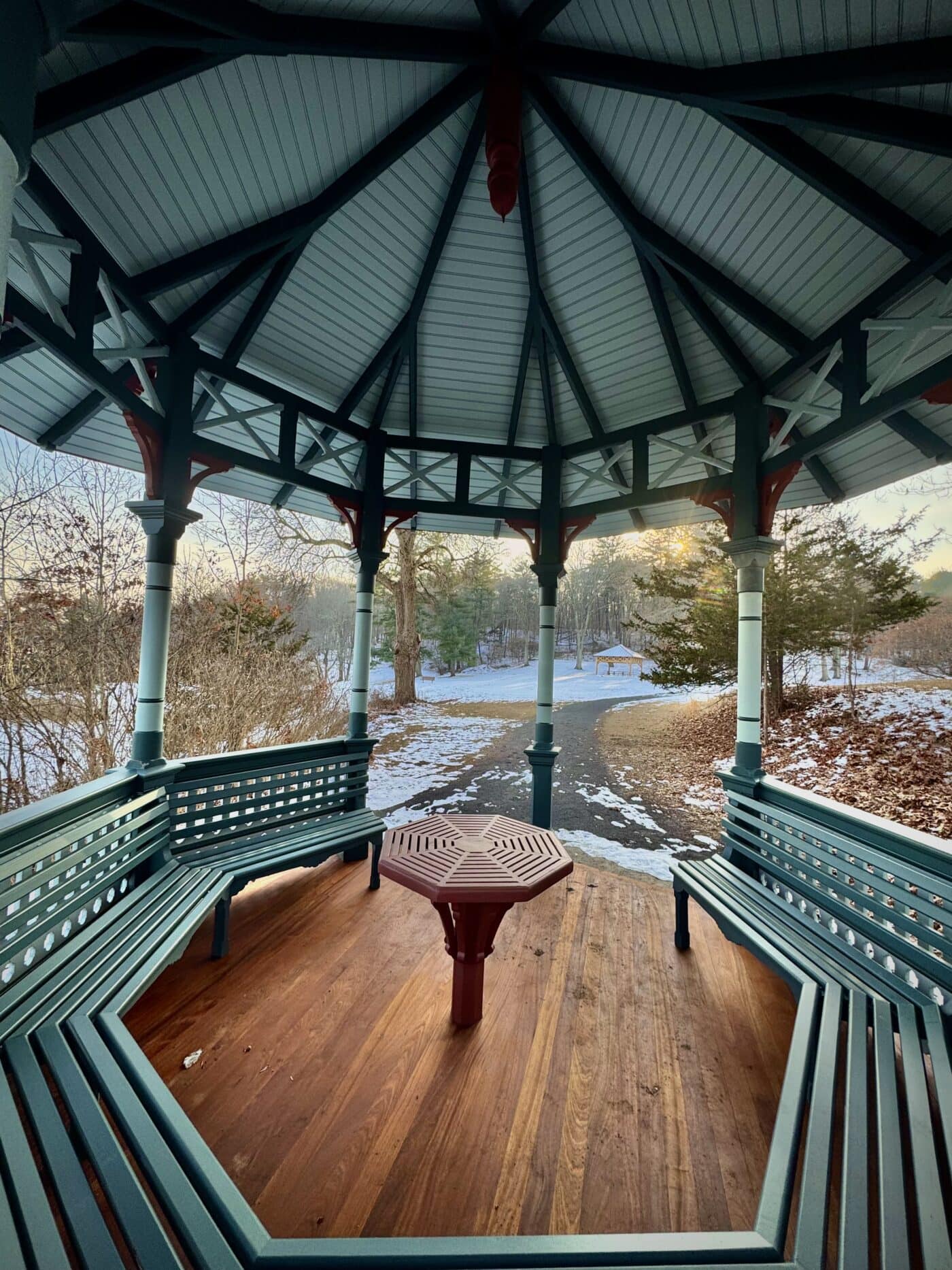 The preserve is well known for its iconic suspension bridge, which is a romantic spot to pause and watch the creek below. For a fresh discovery, though, try its sweet new pavilion.