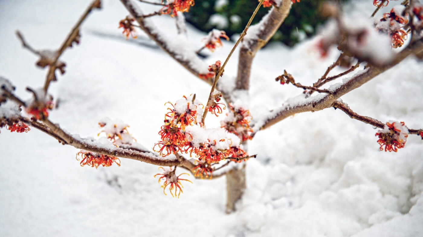 Hamamelis virginiana is native to the Northeastern U.S. and blooms from October into December. Witch hazel is part of the Hamamelidaceae family, which has some kin in China and Japan — but most of this family is native to North America. As summer turns to autumn, the light green, toothy leaves turn to warm yellow ovals. If you see witch hazel blooming in January and February, these are Hamamelis vernalis. Together they bloom through winter, one picking up where the other left off.